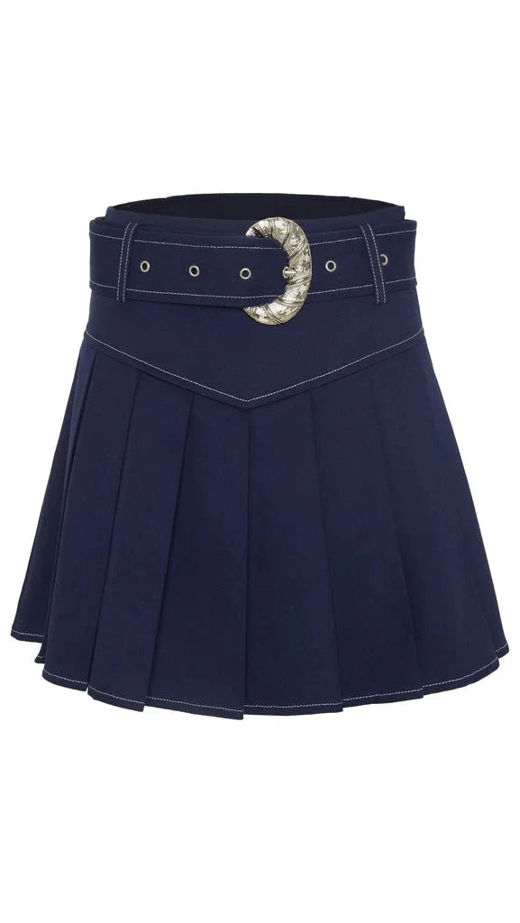 A structured pleated mini designed with a high waist and a statement metal buckle belt. The Ella Skirt brings a refined, preppy silhouette with crisp pleats and contrast stitching that highlights its tailored shape. A polished yet youthful piece that pairs effortlessly with blazers, shirts, or knits.